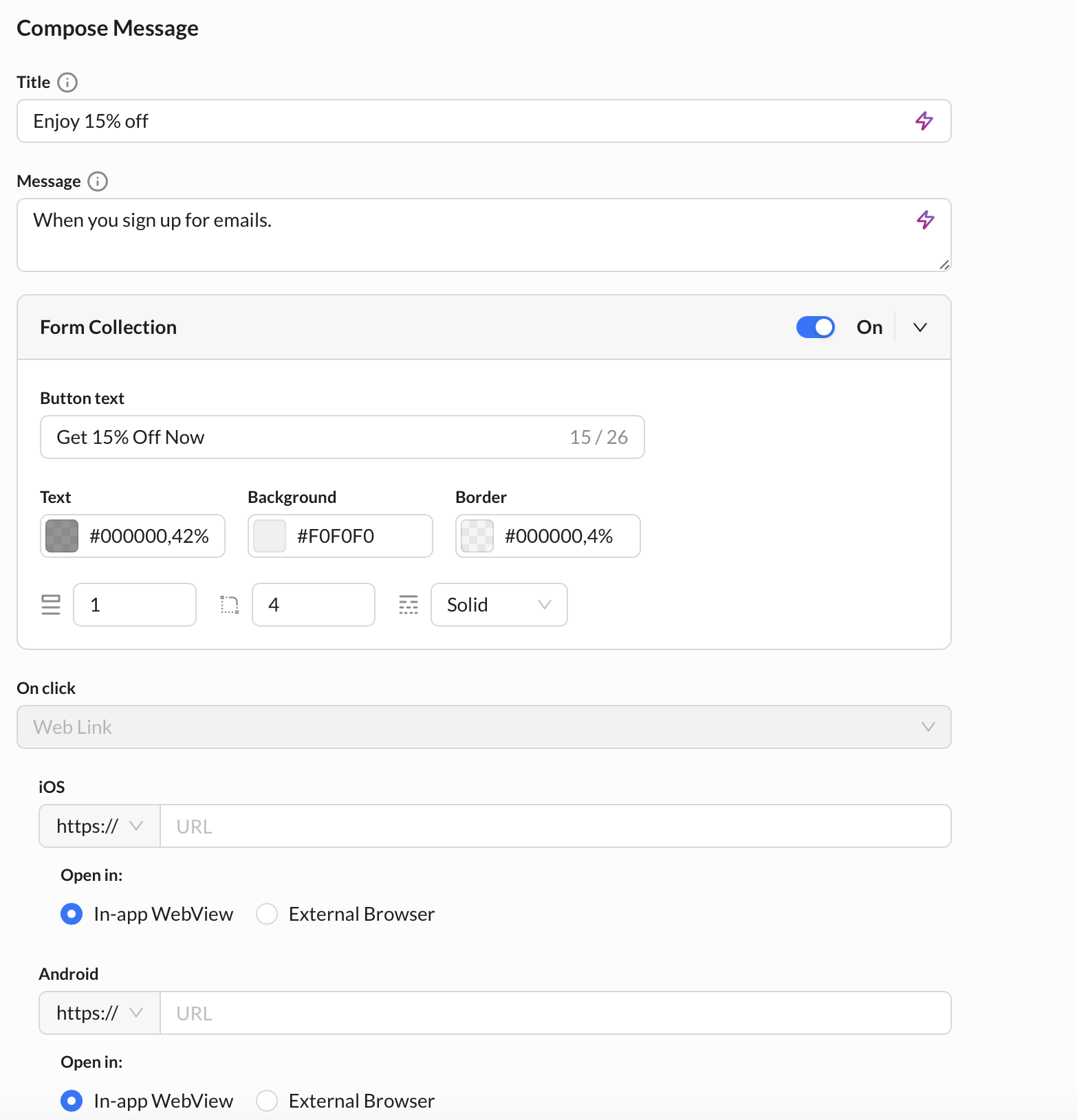 3. OnClick Options: Choose one of the following actions for when a user taps on the message: